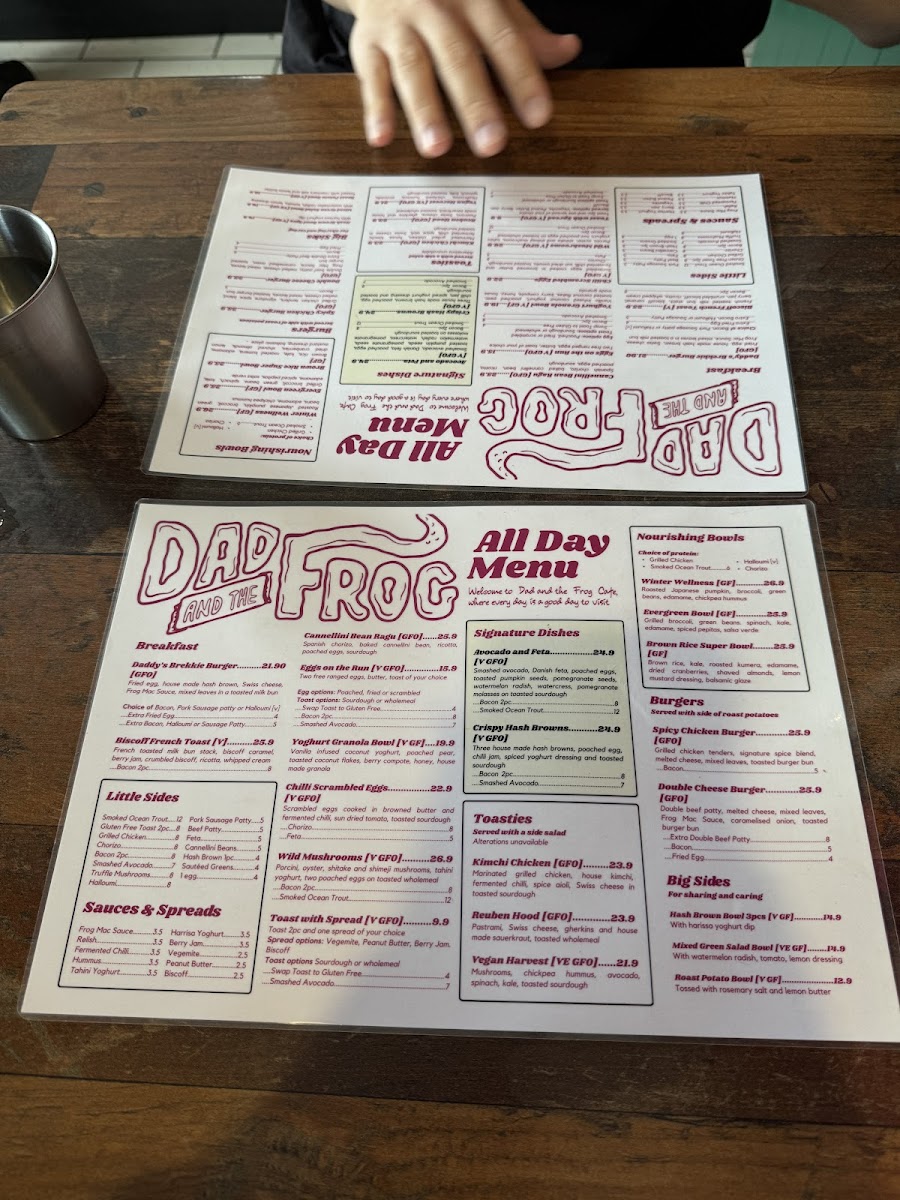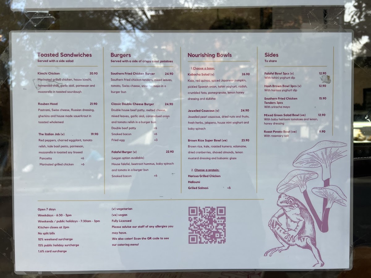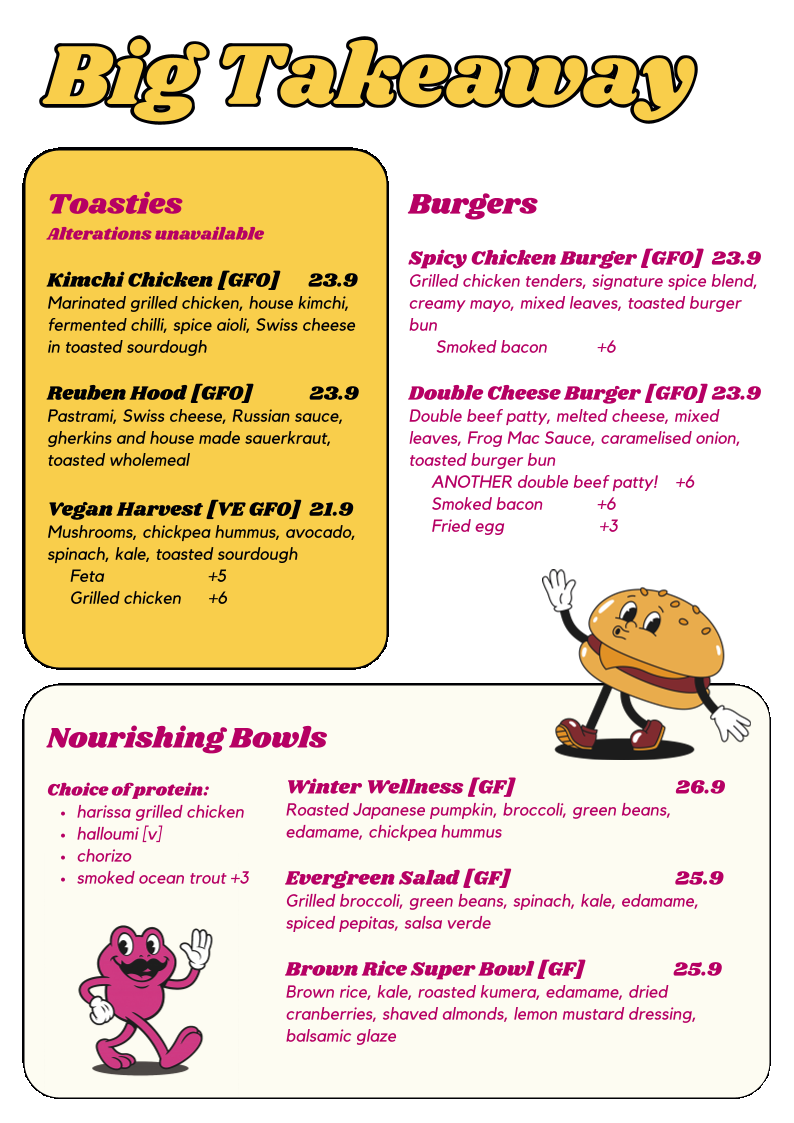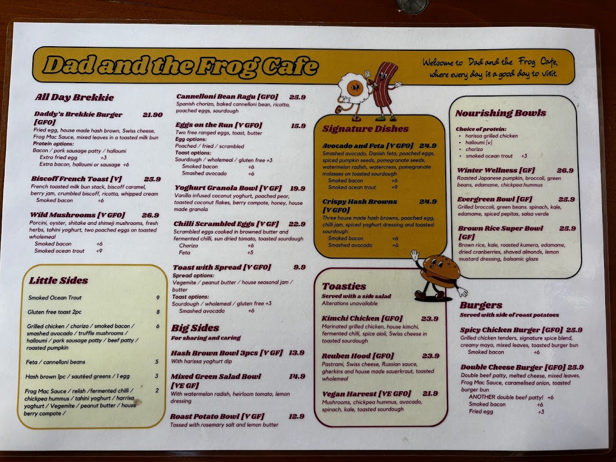 From a reviewer’s perspective, the menu at Dad And The Frog Café offers a well-rounded selection that balances classic café comfort with more distinctive options, making it suitable for both dine-in and takeaway. The all-day menu features satisfying staples like Toasted Sourdough/Wholemeal/Soy Linseed, Yoghurt Granola Bowl, Biscoff French Toast, Eggs on the Run, and Daddy’s Brekkie Burger, while the signature toasted sandwiches such as Vegan Harvest, Kimchi Chicken, and Reuben Hood stand out as flavorful highlights. For healthier choices, the nourishing bowls including Winter Wellness, Evergreen Bowl, and Brown Rice Super Bowl provide hearty yet balanced meals. The kids menu keeps things simple with the Ham & Cheese Toastie, and takeaway options expand the selection with items like Brekkie Roll, Ham & Cheese Croissant, Cheese, Tomato Croissant, and Quiche of the Day. The café also offers takeaway versions of popular items like Vegan Harvest, Kimchi Chicken, Reuben Hood, Kabocha Salad, Pomedori Secchi, and Brown Rice Super Bowl. For those craving something more indulgent, the burger selection includes the Fried Chicken Burger and Double Cheese Burger, complemented by generous sides such as Hash Brown Bowl 3pcs, Mixed Green Salad Bowl, and Roast Potato Bowl, making the menu diverse, satisfying, and suitable for a wide range of tastes.