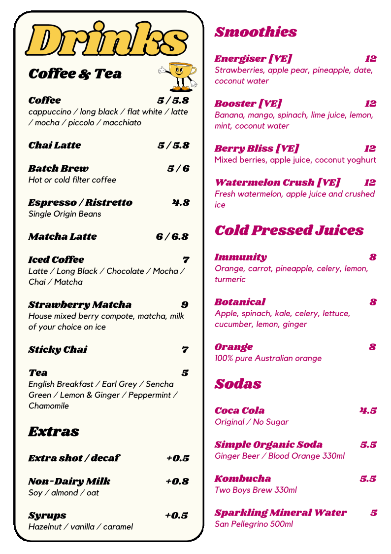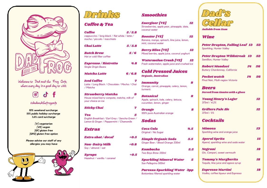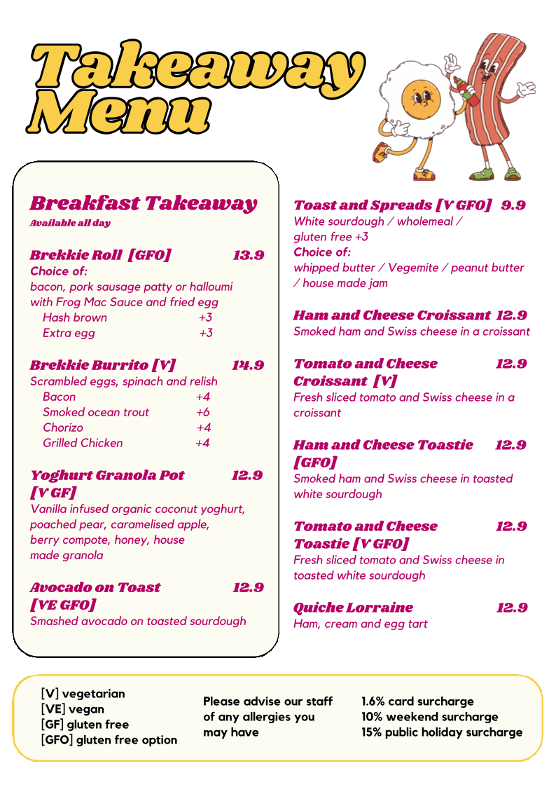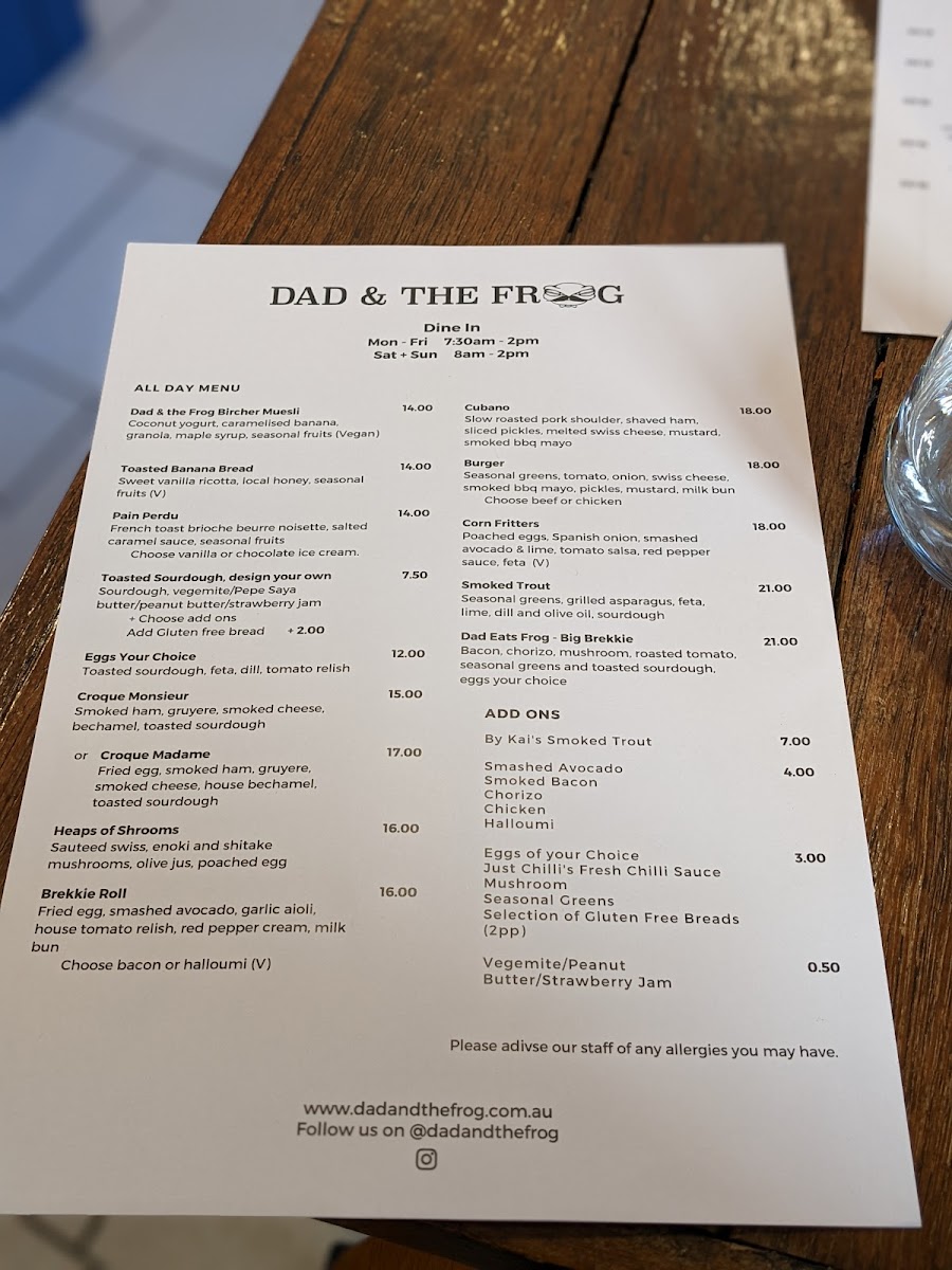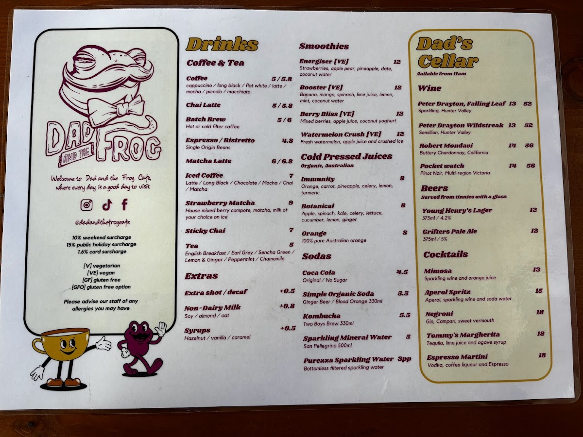From a reviewer’s perspective, the menu at Dad And The Frog Café offers a well-rounded selection that balances classic café comfort with more distinctive options, making it suitable for both dine-in and takeaway. The all-day menu features satisfying staples like Toasted Sourdough/Wholemeal/Soy Linseed, Yoghurt Granola Bowl, Biscoff French Toast, Eggs on the Run, and Daddy’s Brekkie Burger, while the signature toasted sandwiches such as Vegan Harvest, Kimchi Chicken, and Reuben Hood stand out as flavorful highlights. For healthier choices, the nourishing bowls including Winter Wellness, Evergreen Bowl, and Brown Rice Super Bowl provide hearty yet balanced meals. The kids menu keeps things simple with the Ham & Cheese Toastie, and takeaway options expand the selection with items like Brekkie Roll, Ham & Cheese Croissant, Cheese, Tomato Croissant, and Quiche of the Day. The café also offers takeaway versions of popular items like Vegan Harvest, Kimchi Chicken, Reuben Hood, Kabocha Salad, Pomedori Secchi, and Brown Rice Super Bowl. For those craving something more indulgent, the burger selection includes the Fried Chicken Burger and Double Cheese Burger, complemented by generous sides such as Hash Brown Bowl 3pcs, Mixed Green Salad Bowl, and Roast Potato Bowl, making the menu diverse, satisfying, and suitable for a wide range of tastes.